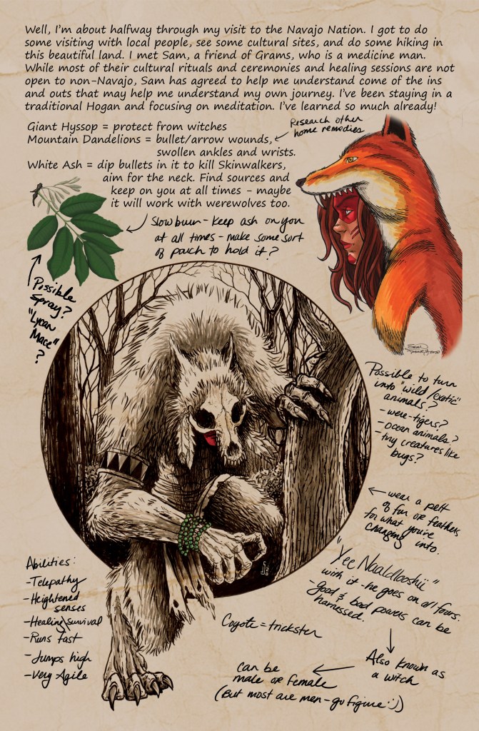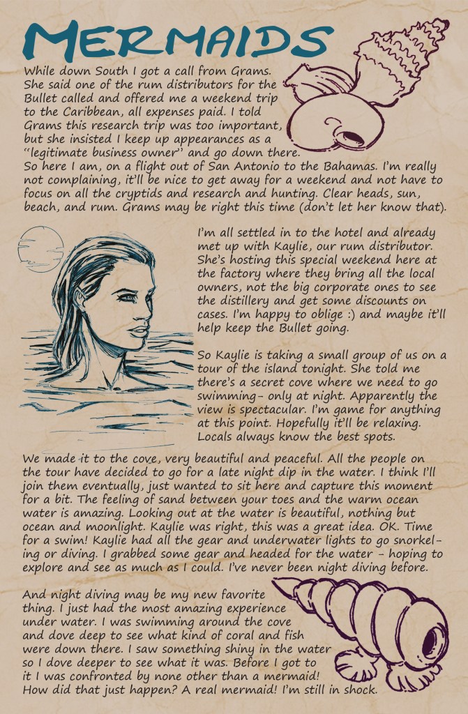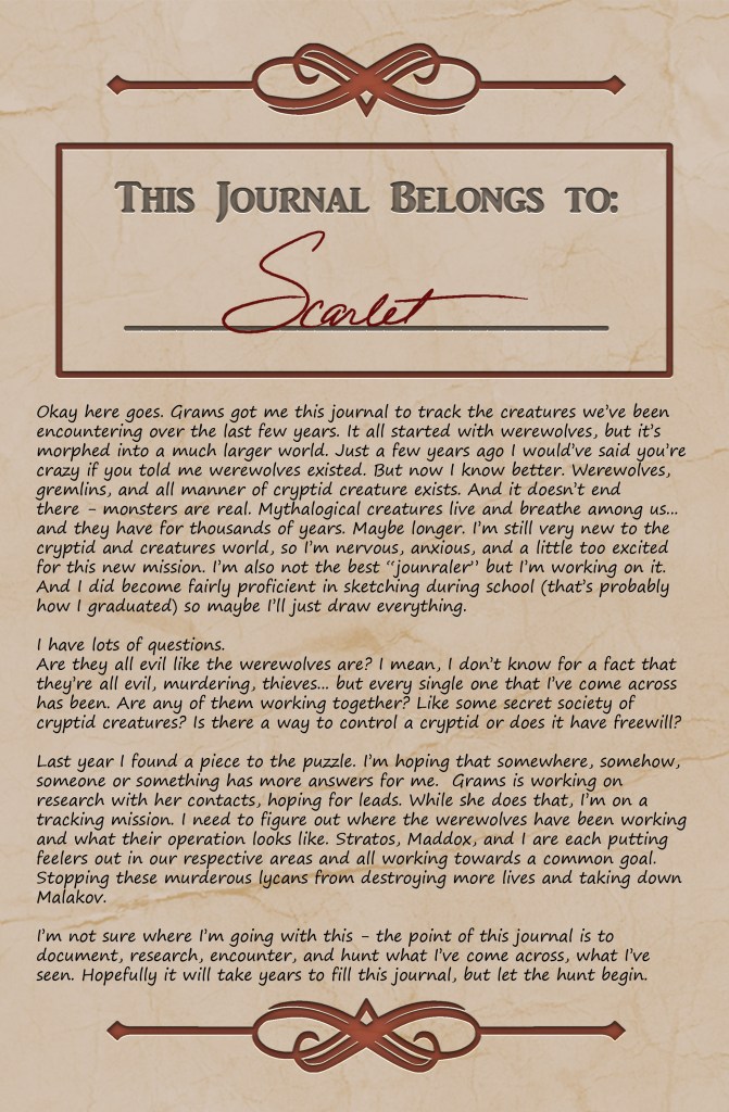 Scarlet’s Field Guide to Cryptids & Other Creatures is a collection of short stories in field journal format from Scarlet’s point of view as she travels around the world encountering and tracking cryptids and discovering other creatures for the first time. Scarlet is on a mission to track her archenemy, the werewolves, while she continues to search for answers in her mother’s death. The book collects stories and eyewitness accounts of 30 different cryptids and creatures.